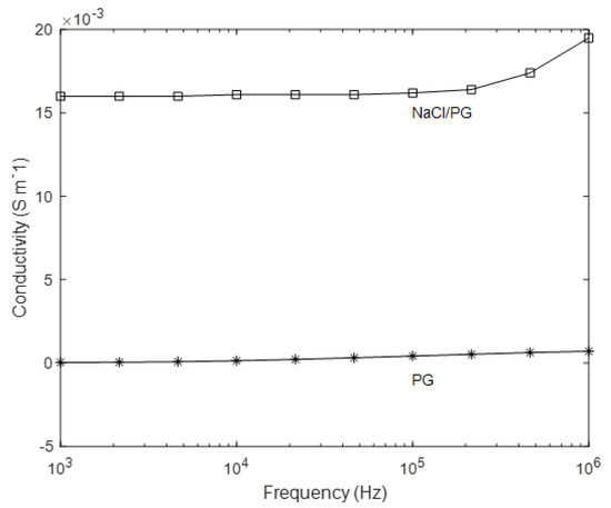 Electrical conductivity of pure PG and NaCl/PG solution in the frequency range between 1 kHz and 1 MHz.