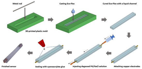 The fabrication process of the strain sensor is illustrated in Figure 2. A plastic mold with a cuboid-shaped cavity was fabricated using the 3D printing technique. A metal rod with 1 mm diameter was placed onto elevated segments located at both ends of the cavity. To construct a stretchable channel for embedding a sensing liquid, part A and part B of silicone rubber (Eco-Flex 00-20, Smooth-on) were mixed at a mass ratio of 1:1 and thoroughly stirred. After degassing using a vacuum chamber to remove the enclosed air bubbles, the liquid mixture was slowly cast into a mold and cured for four hours at room temperature. Subsequently, the cured silicone rubber was released from its mold, along with the metal rod carefully extracted and left the silicone rubber with an empty channel in place. Two copper rods were attached to both ends of the channel to serve as electrodes. Then the degassed NaCl/PG solution was gently injected through the edge between the channel and electrode at one end using a syringe, while the air inside the channel was pushed out through a syringe needle at the other end till the channel is entirely filled with the liquid. In the end, the edges along the perimeters of the electrodes and the fluid channel were sealed using cyanoacrylate glue. The obtained sensor has a 10 mm by 5.4 mm dimension for the transverse cross section and a length of 40 mm for the liquid channel.