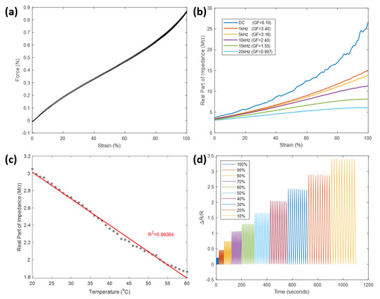 Characteristics of the strain sensor. (a): Force-strain relation determined by the mechanical tensile test. (b): Sensitivity variation due to the effect of the excitation frequency. (c): Resistance variation due to the effect of ambient temperature. (d): Relative change in resistance in the cyclic loading test.
