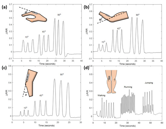 Motion detection To demonstrate the capability of the sensor as an effective wearable device for detecting various types of motions, the sensor was mounted to different spots on the human body, including fingers, forearms and legs, as illustrated in Figure 6a–c. The two ends of the sensor were attached to the indicated locations using duct tapes. The relative change in resistance of the sensor was recorded when each joint was bent to approximately 15, 45 and 90 degrees three times, respectively. The result obtained from each position exhibits excellent reproducibility, implying the sensor can function reliably at multiple locations and has the potential to be derived into a full-body motion detection system. The sensor mounted to the leg was further tested for its ability of discriminating ordinary actions such as walking, running and jumping. It can be seen from Figure 6d that these motions can be clearly distinguished from the acquired signal. The signal for walking shows steady rise-and-fall cycles which are corresponding to each step; while the signal for running has more frequent oscillation, indicating faster paces. The signal for jumping has a unique recoil at the end of every cycle due to the buffer to the impact upon each landing.