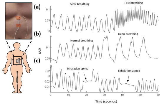 Respiration monitoring Furthermore, we demonstrate the employment of the prepared sensor for breath monitoring, including measurement of respiration rates, respiratory volumes and detection of apnea. The sensor was directly attached with a tape to the lower chest, in the region next to the diaphragm which separates the chest from the abdomen. The influence of lung ventilation during each breathing cycle on the epidermal strain variation is extreme at this location. The response of the sensor to the subtle skin deformation induced by different breathing conditions over a period of 60 s is illustrated in Figure 7a–c, respectively. As shown in Figure 7a, the sensor experienced deformation in sync with each breathing cycle during both slow breathing and fast breathing, and the frequency of the oscillation in its signal can be clearly used to measure the respiration rate. Figure 7b shows the response of the sensor to normal breathing and deep breathing. Apart from having a lower frequency, the portion of the signal corresponding to deep breathing also has a higher magnitude than the portion of normal breathing, indicating deep breathing has a lower respiration rate and larger respiratory volume. Apnea is the paused breathing that occurs typically during sleeping, and it may happen hundreds of times every night. Apnea is caused by involuntary overrelaxation of the muscles in the upper throat which blocks the airway. Prolonged apnea results in severe lack of oxygen which may cause brain damage and even death in the worst scenario. A demonstration of using the proposed sensor for detecting apnea is shown in Figure 7c. The interruption in the measured signal due to apnea during both inhalation and exhalation process were distinctively observed as two regions of flat signal that indicate temporary halt of breathing, implying the sensor as an effective tool for apnea detection.