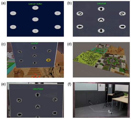 UI of the system developed. (a) Button interface for the training session. (b) Button interface for the online session. (c) VR content to control a virtual drone. Desert map is shown. (d) All four maps (park, dessert, maze, and forest). (e) AR contents to control a real drone. Button interface is shown. (f) A real video in HMD streamed from the drone.