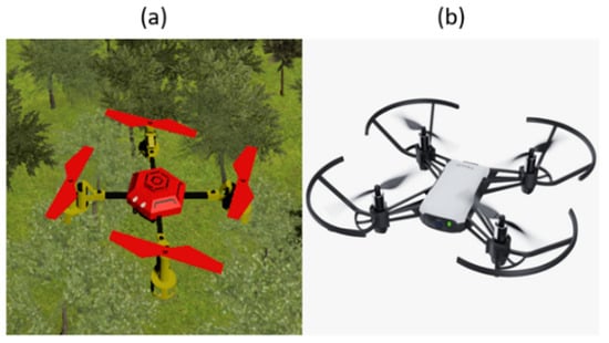 Images of a drone used in this system: (a) a drone used in the virtual environment and (b) a drone used (DJI-Tello) in the real environment.