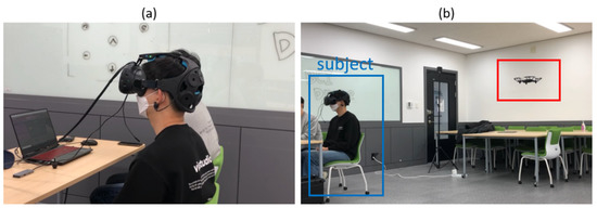 Experimental view. (a) A subject wearing HMD is playing the drone control system. (b) A real drone (red box) is being controlled by a subject (blue box) through the AR-drone control system.