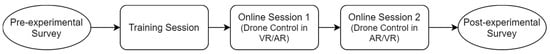 Each experiment took a total of 50 min. The experimental procedure is shown in Figure 6. Before and after the experiment, the experimental survey was conducted. Training sessions were conducted to generate a classifier, followed by online sessions to control the drone. Half of the participants engaged in the AR online session after the VR online session and the other half engaged in the VR online session after the AR online session. To test their accuracy in the online session, the subjects were instructed to move the drone according to the instructions given at the top in the display. Each subject played 15 selections (15 in VR and 15 in AR) in two online sessions.