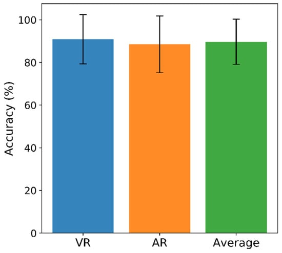 Mean accuracy and standard deviation are presented for VR (blue), AR (orange), and the mean of VR and AR (green). No significant difference was observed (p > 0.05).