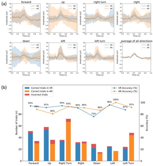 (a) ERP signal (n = 17) averaged over seven directions (forward, up, down, right, right turn, left, and left turn) in VR (blue line) and AR (orange line) environments. Standard deviations are presented with areas. (b) All subjects’ direction-based accuracy.