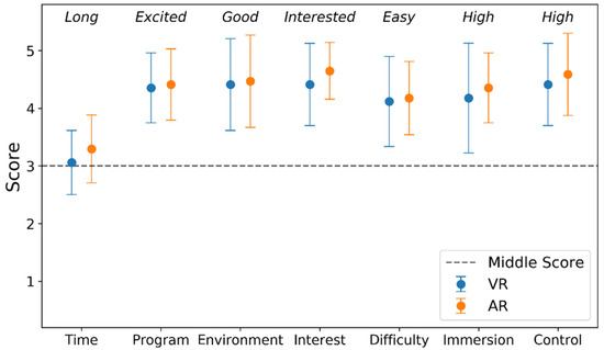 To compare the users’ satisfaction in VR and AR, seven items (time length, program, environment, interest, difficulty, immersion, and feeling of self-control) were evaluated. Each item was scored from one to five points on VR and AR and three points indicates moderate or neutral. The mean score and standard deviation for the seven items evaluated are shown in Figure 9. The Wilcoxon signed-rank test showed that the users’ experience of the seven items did not differ significantly in the VR and AR environments (p > 0.05).