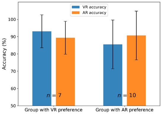 The mean accuracy between VR and AR did not differ significantly in Section 3.1.1. However, the accuracy differed slightly depending upon the subjects’ preferred environment. Figure 10 shows the group’s mean accuracy according to preference. The mean accuracy in the group that preferred VR (n = 7) was 93.1% in VR and 89.33% in AR, which indicates that VR accuracy was slightly higher than that in AR. In addition, the group that preferred AR (n = 10) showed greater accuracy in AR (90.67%) than VR (85.48%). However, the statistical test showed no significant difference between the two (VR preferred: p = 0.23336, AR preferred: p = 0.58091).