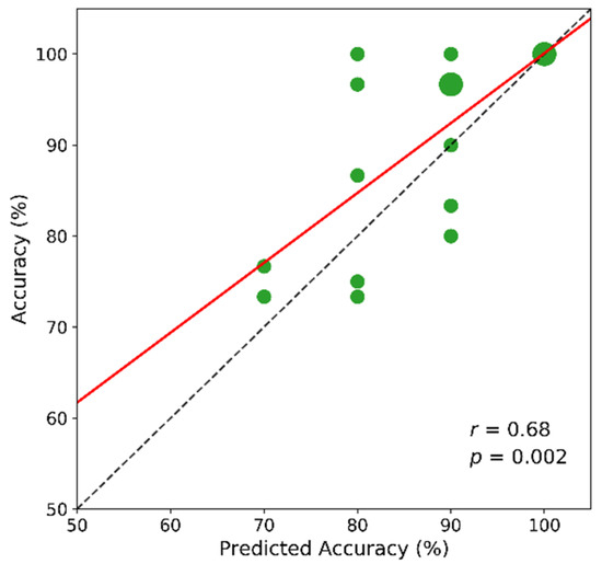 Actual accuracy and users’ self-predicted accuracy. The circle size represents the number of subjects in that point. The dashed line is the y = x line and the solid red is the regression line on the given points.