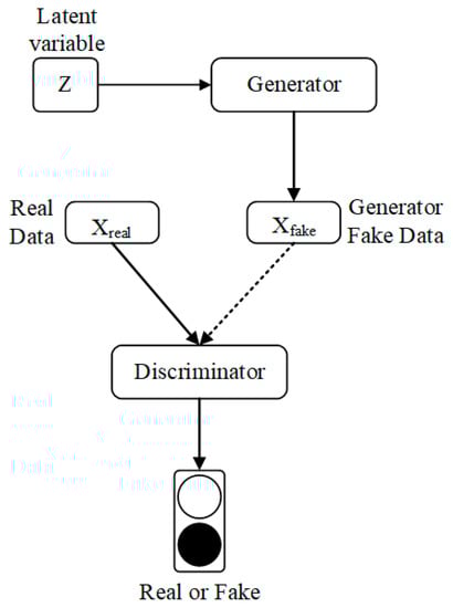 As shown in Figure 1, GAN usually uses random noise Z as the network input to generate the sample Xfake through the Generator network, and the Discriminator network is responsible for determining whether the input sample is the real sample Xreal or the generated sample Xfake. The objective function of the network training is as follows.