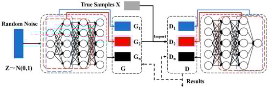 As shown in Figure 2, the model is mainly divided into two parts, generator G and discriminator D. The generator consists of a fully connected artificial neural network, which is divided, according to the number of network layers, into multiple generators such as G1, G2, and Gn. In addition, the connection is achieved by establishing shortcut channels between the network layers to form the final generator model. The underlying neurons of the generators share parameter weights and are input into the network by Gaussian distributed random noise to generate virtual samples. The discriminator consists of fully connected neural networks with a different number of layers to form different discriminators D1, D2, and Dn, and one of them is selected as the discriminator of the network. Among them, the output of the generator and the input of the discriminator are structurally consistent, both being the length of the real sample X. The output of the generator and the input of the discriminator are identical in structure. The pseudocode of the generation process is shown in Algorithm 1.