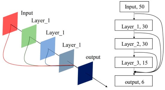 The specific structure of the generator is shown in Figure 3, and the input from the output layer is derived from the output results of all previous network layers. The generator network contains a total of 131 neurons, and the network shares the underlying neuron parameters. The reason for using Sigmoid in the generator input layer is that Sigmoid works very well when there is a significant difference in features, which is continuously enhanced as the cycle progresses. However, the biggest disadvantage of the ReLU function, although it converges quickly, is that the gradient is 0 when the input is less than zero, which results in the negative gradient being set to 0 and the neuron being inactivated. It does not respond to any data, especially when the learning rate is large, which is often small with large neuronal necrosis generators, so ReLU can be used in the remaining layers to speed up training.
