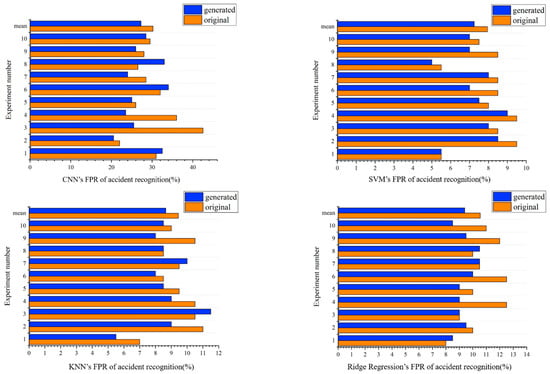 For the problem of traffic accident recognition, the FPR is an indicator of concern. The FPR refers to the probability that the recognition model judges a normal traffic event like a traffic accident. An excessive FPR will lower the reliability of the recognition model and using false alarm results will cause unnecessary losses. Each model uses different dataset FPR results as shown in Figure 6. The value of experiment number 11 is the average value of the previous 10 experiments. By comparing the FPR of accident recognition, it is found that when using only the original dataset, the FPR of accident recognition by SVM is 7.95%, the FPR of accident recognition by KNN is 9.45%, the FPR of accident recognition by ridge regression is 10.55%, and the FPR of accident recognition by CNN is 30.2%. When using the model trained on the original + generated dataset, accident recognition by SVM is 7.25%, the FPR of accident recognition by KNN is 8.65%, the FPR of accident recognition by ridge regression is 9.4%, and the FPR of accident recognition by CNN is 27.25%. Furthermore, the accident recognition FPR of the original + generated data reduces up to 2.95% compared with the accident recognition FPR of the original data. It can also be seen that the quality of the generated data is very high.