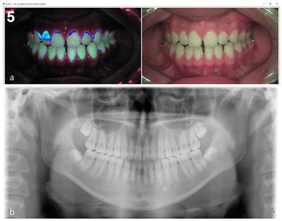 (a) Fluorescent plaque index (FPI) score using propriety software of the quantitative light-induced fluorescence (QLF) system was 5 which shows a serious degree of dental plaque pathogenicity, (b) while the score of radiographic bone loss (RBL) shown in the panoramic image was 1.1 which was close to normal.