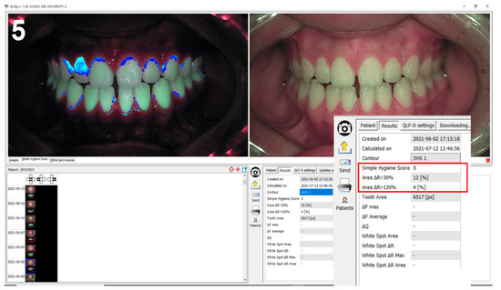 The FPI score for the fluorescent image of the QLF images was automatically calculated with the “Simple Hygiene Score” function of the proprietary analysis program (Q-ray version 1.24, Inspektor Research Systems BV) (Figure 3). FPI was a score calculated by applying two variables (A30 and A120), which are regions of red fluorescent plaques corresponding to pixels with ΔR > 30% and ΔR > 120%, to a specific function. FPI scores were calculated in one of six categories (from 0 to 5) (Figure 4), according to the classification rules as follows [24]. (1) A30 < 0.5 % and A120 < 0.4%, FPI score was classified as 0; (2) 0.5% ≤ A30 < 2.5% and A120 < 0.4% was classified as FPI score 1; (3) 2.5%≤ A30 < 4.5% and A120 < 0.4% was classified as FPI score 2; (4) 4.5 % ≤ A30 or 0.4% ≤ A120 < 0.9% was classified as FPI score 3; (5) 0.9% ≤ A120 < 2.1% was classified as FPI score 4; (5) 2.1% ≤ A120 was classified as FPI score 5. The variable ΔR indicates that porphyrin, a metabolite secreted by bacteria, is present in the oral cavity and assesses the level of bacterial activity.