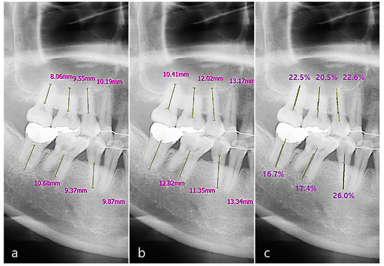 The measurement of RBL (radiographic bone loss) on a panoramic image: (a) the distance from the root tip of the tooth to the periodontal bone level (PBL); (b) the distance from the root tip of the tooth to the cementoenamel junction level (CEJL); (c) the percentage rate of the intersection length of the PBL and the other CEJL.