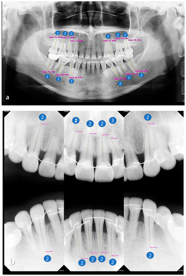 RBL scoring on a panoramic image (a) and periapical radiographic image (b) based on the percentage rate, to classify the periodontal bone loss of the tooth for periodontitis staging according to the new criteria. The classification criteria were as follows. Score 1: RBL < 15%. Score 2: 15% ≤ RBL ≤ 33%. Score 3: 34% ≤ RBL ≤ 66%. Score 4: RBL > 66%.