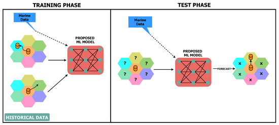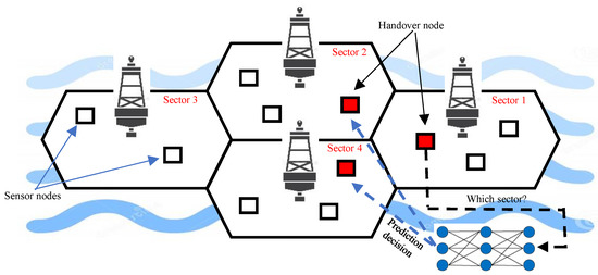 The UWSN in the proposed work consists of a set of sensor nodes and sea buoys that are replaced in a specified area (Figure 1). In this non-static network where node mobility is presented due to the continuous water currents, sensor nodes can move far from their sea buoy (cell centroid). This consequently can lead to the loss of connection between the sensor node and its sea buoy, which requires a successful handover process to help the sensor node to safely attach to a new sea buoy. According to Figure 2, the classifier initiates a training phase based on historical data (i.e., from the Korea Hydrographic and Oceanographic Agency dataset). The proposed ML model considers the sensor’s location, the received signal strength from neighboring buoys, and the weather forecast to predict the suitable buoy to complete the handover process successfully. Finally, in the test phase, the proposed model assists the sensor node in making adequate handover decisions. The structure of the cells is illustrated in Figure 3 and Figure 4.