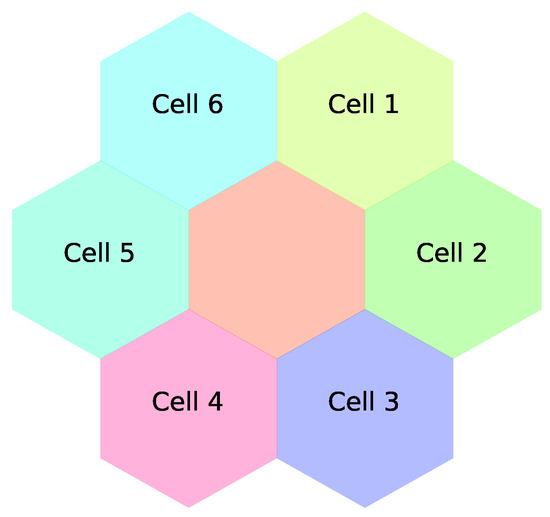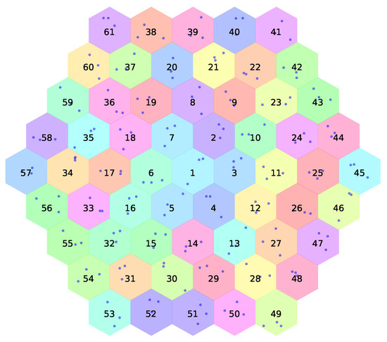 Underwater sensor network nodes can be static or non-static, similar to ground-based sensor network nodes [28]. The latter type moves with water currents due to different activities and circumstances in the underwater environment. This work focuses on non-static sensor nodes. Figure 3 depicts a buoy that is surrounded by six different cells (i.e., buoys). Each buoy of the Korea Hydrographic and Oceanographic Agency is represented by a hexagon that shows its coverage area. The simulation consists of a set of buoys, each of which has a number of sensor nodes (i.e., dots), as shown in Figure 4. The movement of each sensor node is based on the marine data collected by each buoy.