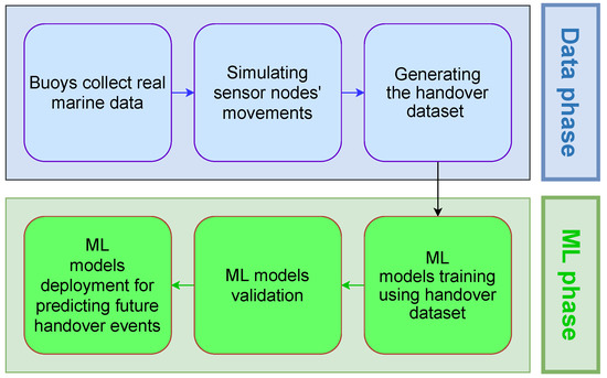 Figure 5 depicts a block diagram of the proposed UWSN handover prediction system. The proposed system consists of two phases: the data collection phase and the machine learning phase. The data collection phase consists of collecting the handover occurrence data. That is, when a handover occurs in the network, the sensor sends environmental data (e.g., sensor location and signal strength of neighbor cells) of the last collected data before the handover. The second phase (the machine learning phase) is responsible for training, validating the machine learning models using handover data, and starting the deployment of the UWSN handover prediction system.