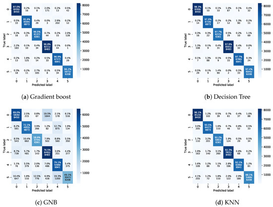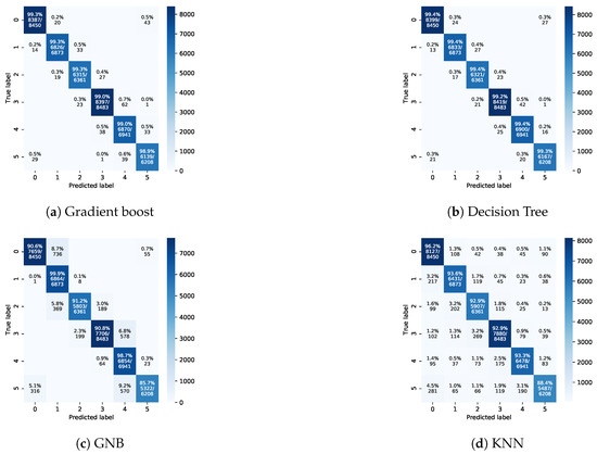 Figure 6 and Figure 7 depict the confusion matrices of the four different classifiers for Exp-I and Exp-II, respectively. The obtained results emphasize the higher results of Exp-I compared to those of Exp-II. In addition, the gradient boosting classifier clearly had the best performance among all classifiers.
