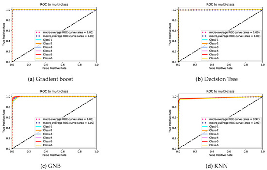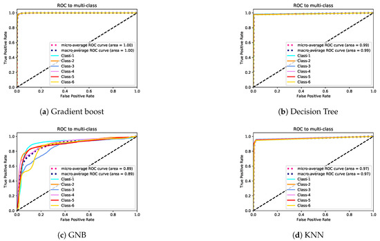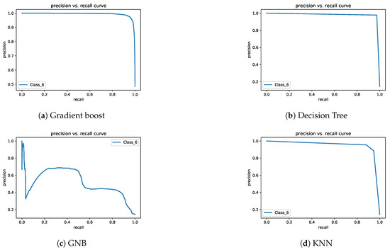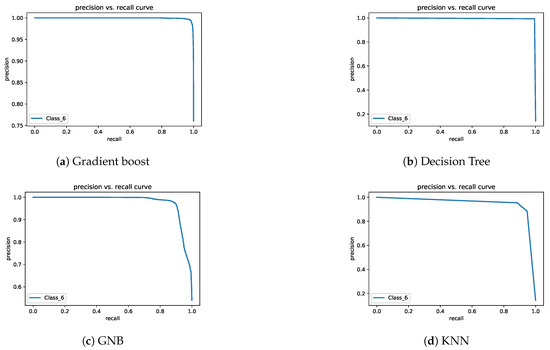 In Exp-II, the classification rates of the gradient boost and decision tree models were almost identical. The KNN model’s performance was lower than that of gradient boost and decision tree models. The GNB model’s accuracy was very low. The lowest class accuracy rates were 97.4%, 95.9%, 88.1%, and 49.1% for decision tree, gradient boost, KNN, and GNB, respectively. Figure 8 and Figure 9 depict the precision–recall curves, and Figure 10 and Figure 11 present the AUC-ROC curves. All of these results are consistent with the aforementioned.