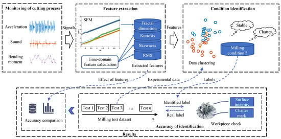 As shown in Figure 1, the signals of acceleration, sound, and bending moment of the cutting process are acquired synchronously. The extracted multiple features are used as the three dimensions of the clustering data to fuse the multi-sensor information. Based on SFM, the fractal dimension of the multiple signals is then calculated. As a comparison, three kinds of commonly used time-domain features are also calculated. Further, the milling condition is identified by data clustering. In the process of pattern recognition, various signal features are clustered separately for accuracy comparison. Finally, the accuracy of the proposed method is verified by comparing the clustering output labels with the actual experimental milling condition, which is verified by various means such as workpiece inspection, FFT and cutting bending moment.