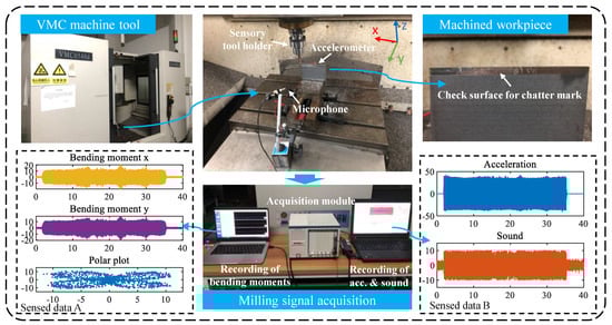The experimental procedure is shown in Figure 2. The milling experiments are performed on a VMC machine with a 4-tooth end mill of 10 mm diameter and a thin-walled titanium alloy part of 100 × 100 × 5 mm. The acceleration signals of the cutting process were collected by an accelerometer DYTRAN 3145A1 on the back of the workpiece to monitor the workpiece vibration. Acoustic signals are collected by a microphone (GRAS 46BE) near the tool and workpiece. The bending moment of the cutting process is collected by the sensory toolholder (SPIKE). The acceleration and sound signals are collected by the acquisition module (NI PXIE-4464) and transmitted to the PC recording system. The bending moment signals are collected by a read receiver unit and transmitted wirelessly to the PC. The polar plot of the cutting moment can then be obtained by the scatter distribution of the bending moment in both x and y directions.