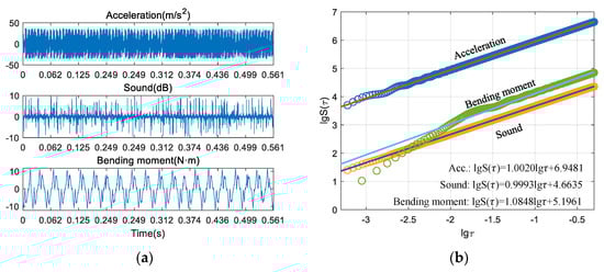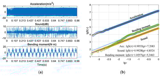 Figure 3 and Figure 4 show the process of calculating the fractal dimension of multiple sensor signals, respectively. Figure 3a shows the cutting signals of one of the experimental tests in the stable condition, and Figure 3b shows the process of calculating the fractal dimension of each signal by the structure function method (SFM). Particularly, to avoid the influence of process parameters on the extracted signal features, the signal is segmented based on the spindle speed and sampling frequency []. Here, 20 revolution data are uniformly selected as the sampling signal. Since the spindle speed of each group of experiments is different, the time scale of each group of experiments is also inconsistent. The fractal dimension can be calculated by combining Equation (6) with the slope of the line obtained from the regression results. Figure 4 shows one of the cutting tests in the chatter condition. It can be seen through the time-domain data that the time-domain characteristics of these three signals are obviously different due to the different acquisition methods. Through Figure 3 and Figure 4, the acceleration, sound, and bending moment signals in both stable and chatter conditions have obvious scale-free intervals, indicating that each sensing signal of the milling process has fractal characteristics, and similar conclusions were obtained in references [,], which is the basis for applying fractal geometry to extract fractal features.