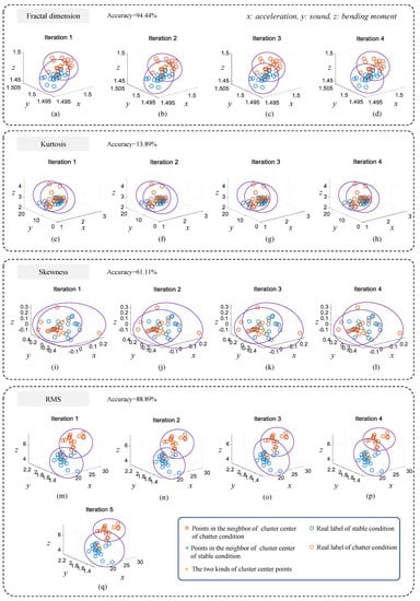 In order to check the accuracy of different time-domain features for identifying milling chatter, all the extracted signal features are clustered separately in this section and the clustering results are examined according to the known labels. Moreover, the signal features of acceleration, sound, and cutting bending moment are taken as three dimensions of the feature space respectively, so as to complete the fusion of multi-sensing information. Note: In the process of applying the clustering algorithm, it is not necessary to know the data labels in advance, and the known data labels are introduced here to check the discrimination accuracy of different signal features. Figure 6 shows the clustering results for each signal feature. As shown in the figure, fractal dimension performs the best, achieving 94.44% classification accuracy after only four iterations, which is even better than some supervised machine learning methods.