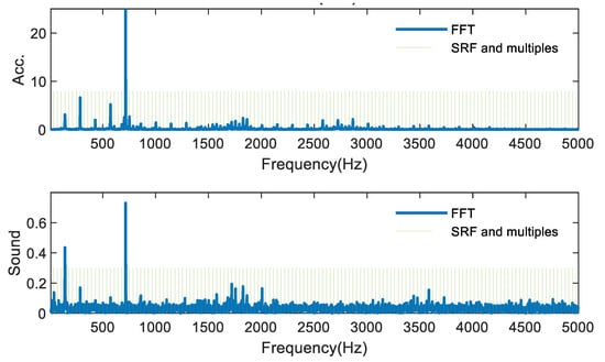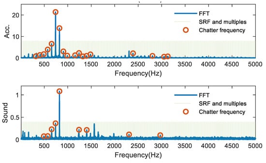 Therefore, in actual experiments, the collected signals are mostly subjected to FFT to analyze the frequency components. When the signal spectrum contains only the tooth passage frequency, spindle rotation frequency and its harmonic frequency, the milling process is considered stable. On the contrary, it can be considered that milling chatter occurs if there are frequency components in the spectrum other than the tooth passage frequency, spindle rotation frequency and its harmonic frequency, and the extra frequency component is considered as the chatter frequency. Figure 7 shows the FFT of the acceleration and sound signals of one group of experiments in the stable milling condition, where the green vertical line represents the spindle rotation frequency and its multiplier frequency. The blue solid line represents the FFT result of the signal. In Figure 7, all of the signal spectra are the spindle rotation frequency and its multiplier frequency, which proves that the cutting process is in stable condition. As shown in Figure 8, the frequency components that are neither the spindle rotation frequency nor its multiplier frequency are the chatter frequencies, i.e., the part marked by red circles. It can be seen that the chatter frequencies are mostly set in the low and medium frequency parts, mainly because, in the thin-walled parts milling process, the chatter frequencies are mostly related to the natural frequency of the workpiece, which is mostly in the low and medium frequency band.