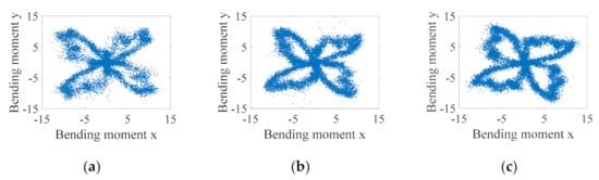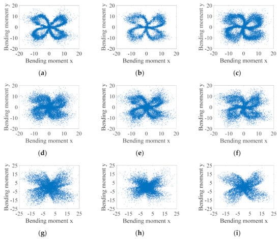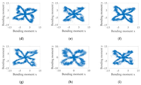 Moreover, it is generally accepted that the cutting bending moment distribution can demonstrate the tool morphology to some extent, and it is often used in industrial software to monitor the tool condition. It was then found in this paper that the bending moment distribution does not necessarily correlate with tool condition alone, especially for thin-walled part milling, where milling chatter largely affects the tool morphology formed by the cutting bending moment distribution, which does not necessarily correlate with tool condition. Figure 9 shows the bending moment distribution for the stable cutting condition, i.e., the bending moment polar plot. Figure 9a–i represent nine groups of experiments for the stable milling condition, respectively. Benefiting from the stable contact between the tool and the workpiece, the bending moment distribution is more concentrated in the stable condition, and the tool morphology can be basically observed more obviously through the polar plot. In contrast, Figure 10 shows nine sets of experiments in the chatter condition, and it can be seen that the cutting bending moment distribution is relatively scattered due to the occurrence of chatter, and the tool morphology can hardly be determined. It is therefore not accurate to monitor the tool condition only by polar plots.