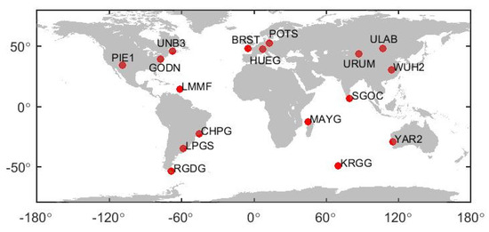 To verify the performance of BDS PPP, observation data of 17 global stations from 1 December 2020 to 20 December 2020 were used. BDS B1CB2a, B1IB3I, and GPS signals can be received by the test stations. Taking a day at one station as a sample, there are in total 340 data samples. The observation data interval is 30 s. Since BDS-3 was built to serve the world, to ensure the objectivity of the evaluation, the selection of the stations around the world should be as uniform as possible. The detailed distribution of the stations is shown in Figure 1.