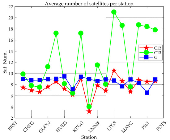 For the same observation data, regardless of whether static PPP or kinematic PPP, the number of satellites involved in positioning is the same. This article counts the average number of satellites participating in BDS (B1CB2a), BDS (B1IB31), and GPS (L1L2) PPP for 17 stations, as shown in Figure 2. The PPP availability of this station can be better reflected by the average number of satellites. The stations with a small average number of satellites shown in Figure 2 can basically correspond to the stations excluded in Table 2.
