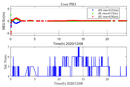 For the overall performance of static PPP, due to the limited number of satellites, there are large errors, which have a great impact on positioning statistics and lack statistical objectivity. Figure 3 shows the static PPP error at station PIE1 for BDS-2+3 (B1IB3I), and the number of satellites involved in positioning on DOY 343 in 2020. In Figure 3, there are less than five satellites participating in static PPP for a long time, and the position information cannot be calculated in static PPP.