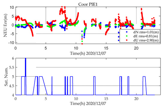 For kinematic PPP, the number of satellites has a very large impact on positioning. When the number of satellites is less than five, abnormal jumps occur, as shown in Figure 4.