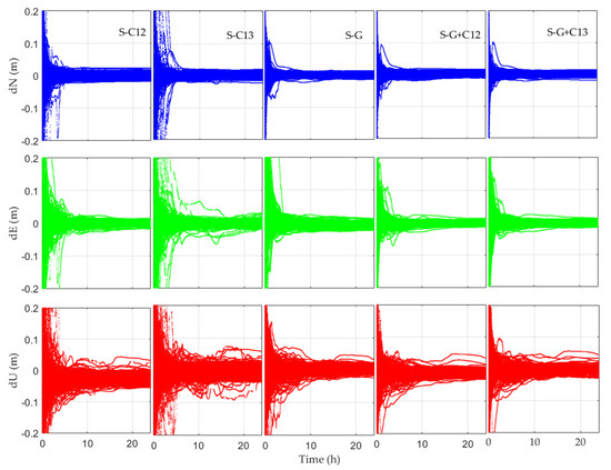 The precise orbit and clock offset provided by GBM are used to perform static PPP of BDS (B1CB2a). Figure 5 demonstrates a static PPP error series for 20 days at 17 stations utilizing GBM’s precise orbit/clock corrections. All results for the 20 days at 17 stations are plotted in the same figure. The premise is to eliminate the abnormal values in Table 2, where S represents the results for static PPP. It can be seen that all PPP solutions can reach convergence but with significantly different convergence times. In the meantime, the positioning errors in the N and E directions are obviously smaller than those of the U component.