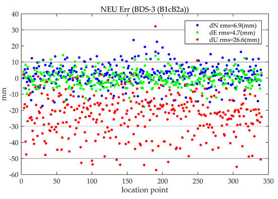 When performing static PPP, the last epoch of a one-day solution is taken as the result of the static positioning of that day (mark with location point; no explanation is given for the subsequent static PPP position error statistics, and the same processing method is used). Figure 6 shows the distribution of the north (N), east (E), and upward (U) positioning errors of all stations on all days (BDS(B1cB2a)). It can be seen that the accuracies of BDS (B1cB2a) static PPP in the three directions of N, E, and U are 6.9 mm, 4.7 mm, and 26.6 mm, respectively. Compared with the horizontal error, the distribution of vertical error is more scattered.