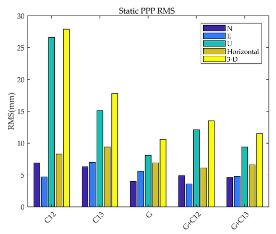 To further compare and analyze the static PPP performance of BDS-3 (B1cB2a), GPS (L1L2), BDS-2+3 (B1IB3I), GPS + BDS-3 (B1cB2a), and GPS + BDS-2+3 (B1IB3I), static PPP are also processed. To facilitate the analysis of the gap between the frequency and system combination of BDS and GPS, the RMS values of BDS-3 (B1cB2a), BDS-2+3 (B1IB3I), GPS, GPS + BDS-3 (B1cB2a), and GPS + BDS-2+3 (B1IB3I) static PPP error in the north, east, upward, and horizontal directions, and in three-dimensions (3D), are calculated.
