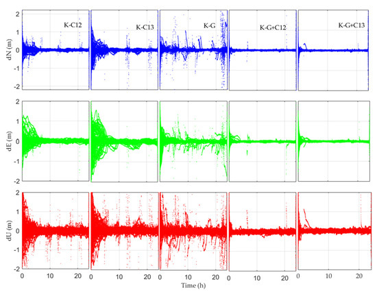 The kinematic solutions of all stations are shown in Figure 8, where K represents the results for kinematic PPP. Unlike the static solutions in Figure 5, the Y-axis in Figure 8 is expanded to ±2 m for a clearer view. Similar to static solutions, the kinematic positioning errors in the vertical component are larger than those of the horizontal component. However, the kinematic positioning errors are obviously larger when compared with the static solutions.