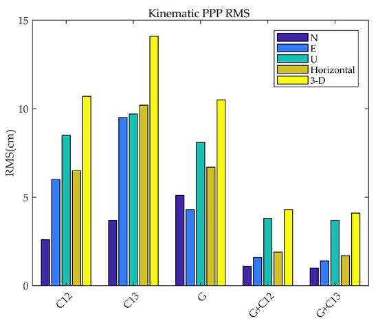 To better compare the results of BDS-3 (B1cB2a) kinematic PPP, the RMS of kinematic PPP are calculated for BDS-3 (B1cB2a), GPS, BDS-2+3 (B1IB3I), GPS + BDS-3 (B1cB2a), and GPS + BDS-2+3 (B1IB3I) in the N, E, U, and horizontal directions, and in 3D, as shown in Figure 10.