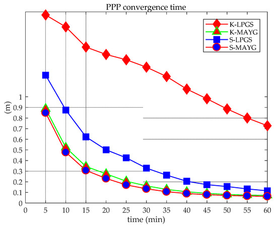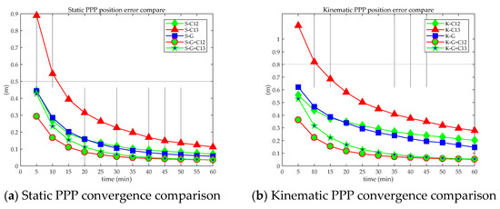 Compared with RTK, PPP requires a longer convergence time to achieve centimeter-level positioning accuracy. In this section, factors of kinematic and static PPP convergence time are discussed from the previous hourly convergence performance and receiver antenna type.
