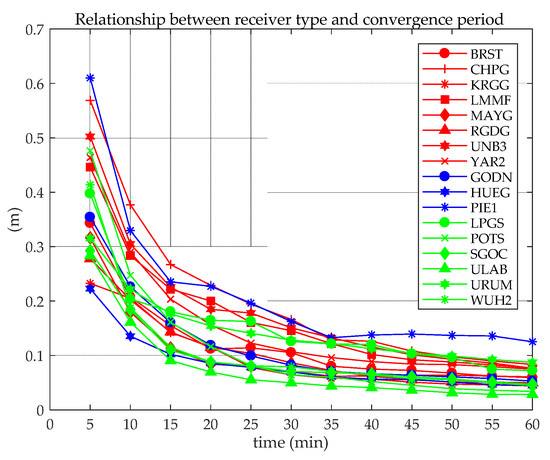 The 20-day data are used for static PPP, and the positioning error of each station during the first hour is analyzed according to the receiver type, as shown in Figure 13.