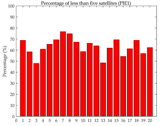 Figure 13 shows that there is no obvious difference between the receiver type and the convergence time. The main reason is the technological advancement of various manufacturers, and the antenna of the high-end receiver has little effect on BDS (B1CB2a) PPP. The PPP convergence speed is closely related to the number of satellites. Figure 14 shows the percentage with less than five satellites participating in static PPP at the PIE1 station in a day (20 day in total). Compared with other stations, the static PPP of PIE1 station has a poorer convergence performance, as shown in Figure 13. The percentage of PIE1 stations with less than five satellites participating in the 20-day PPP solutions is more than 40%, and the static PPP does not converge to less than 0.1 m within 60 min.
