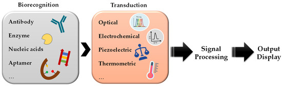 Although the traditional analytical methods described so far have a good detection success rate, there is a need for alternative methods that are cheaper, more sensitive, and faster and can be used as a screening tool to evaluate multiple samples in a reasonable amount of time. Biosensors are an alternative to these classical methods as they can detect a wide range of biotoxins in a sensitive and selective manner and can be used as portable and rapid techniques without the need for qualified personnel [69]. A biosensor is an analytical device consisting of a biorecognition element in conjunction with the transducer responsible for converting the recognition reaction into a measurable signal [70] (Figure 1). In this way, biosensors can be classified according to the bioreceptor element and the transducer type. In the first case, they can be classified as immunosensors, aptasensors, enzymatic sensors, nucleic acid sensors, and cell-based sensors [70]. Biosensors can also be categorized by physicochemical signal transduction, with electrochemical, optical, thermal, and piezoelectric sensors being the most common [71].