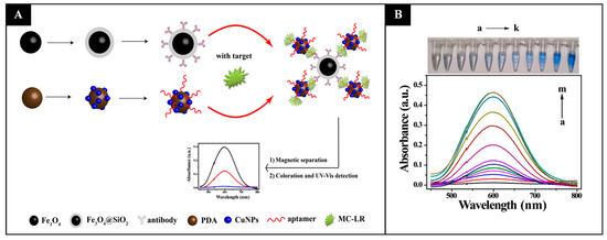(A) Schematic representation of microcystin-LR detection using a colorimetric method based on magnetic separation and copper nanoparticle conversion to Cu2+ ions, which then react with bis(cyclohexanone)oxaldihydrazone. (B) This reaction gives rise to a blue solution, whose color intensity increases with the concentration of microcystin-LR (nmol L−1): (a) 0, (b) 0.05, (c) 1.0, (d) 2.0, (e) 3.0, (f) 4.0, (g) 5.0, (h) 10.0, (i) 15.0, (j) 20.0, (k) 25.0, (l) 30.0, and (m) 35.0. (Reproduced under the terms and conditions of Creative Commons Attribution (CC BY) license [78]).
