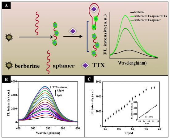 Lan et al. (2019) chose a different strategy and used a specific nucleic acid aptamer for tetrodotoxin that switches its conformational structure from a single-strand random coil to a compact neck ring structure in the presence of the biotoxin. Therefore, insertion of the fluorophore between the random coil leads to changes in the fluorescence signal due to conformational changes of the aptamer that depend on the concentration of tetrodotoxin. Using this method, a LOD of 0.074 nmol L−1 was determined [95] (Figure 3).