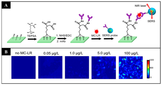 (A) Schematic representation of microcystin-LR (MC-LR) detection by an immunosensor and SERS probe. (B) Representative SERS images for increasing concentrations of the biotoxin. (Reproduced with permission [98], Copyright 2019, American Society of Chemistry).