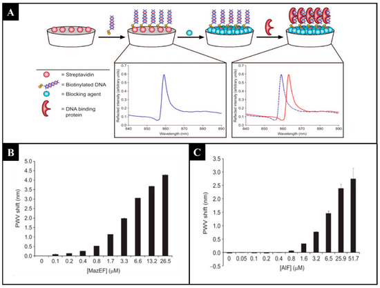 (A) Example of an HTS based on photonic crystals for the study of protein–DNA interactions, where the peak wavelength value (PWV) is measured, in particular for different concentrations of (B) toxin–antitoxin chromosomal module of Escherichia coli (MazEF) and of (C) apoptosis-inducing factor (AIF). (Reproduced with permission [152], Copyright 2008, American Society of Chemistry).